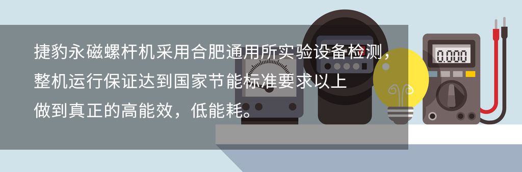 - 節能要求:隨著社會的不斷進步和科學的發展,節能已經越來越成為人們關心的話題。沒有高效節能效果,就算購買的空壓機再便宜,導致用電成本增高,那也是得不償失的;捷豹永磁螺桿機采用合肥通用所實驗設備檢測,整機運行保證達到國家節能標準要求以上,實現節能12%-20%,做到真正的高能效,低能耗。